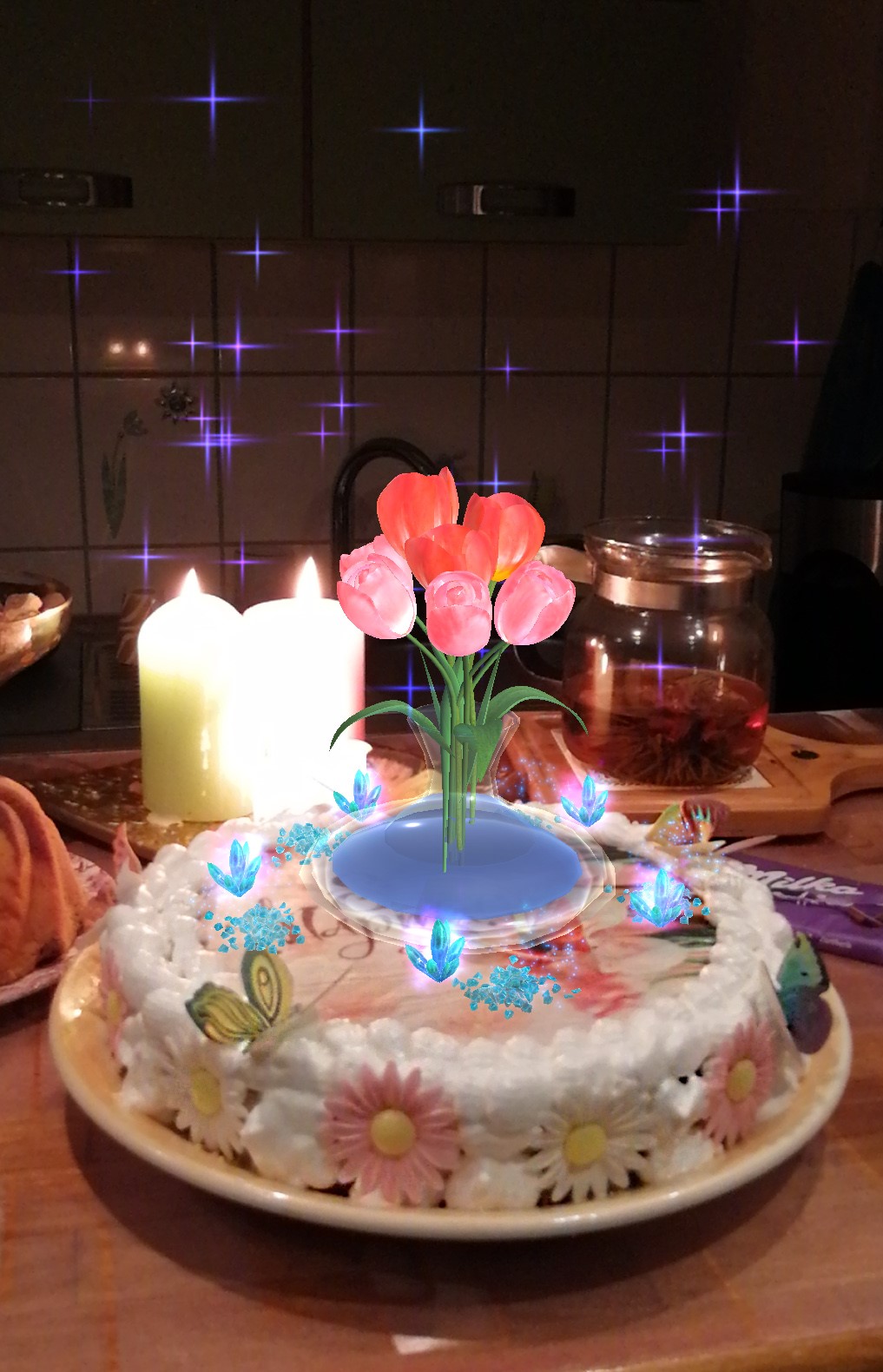 Der Wow-Effekt entsteht durch eine fein inszenierte Szene über der Torte: ein floraler Strauß, schimmernde Kristalle, funkelnde Sterne und ein Moment der Überraschung, der ohne aufwendige Vorbereitung einen starken emotionalen Eindruck hinterlässt.